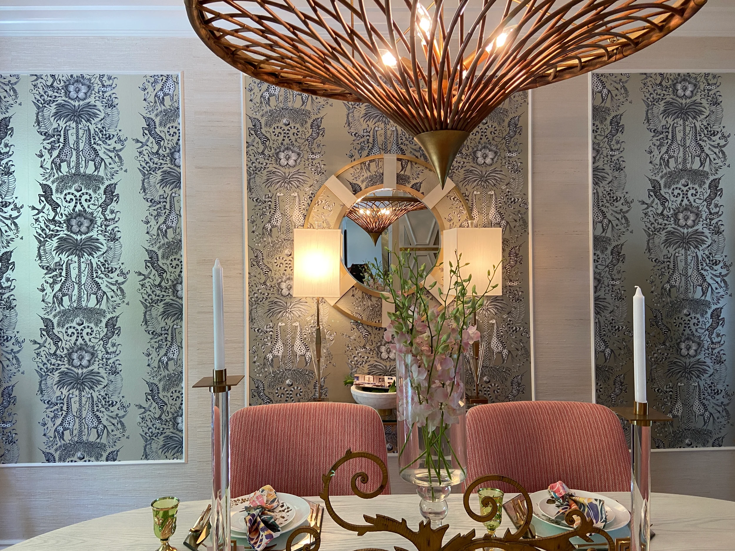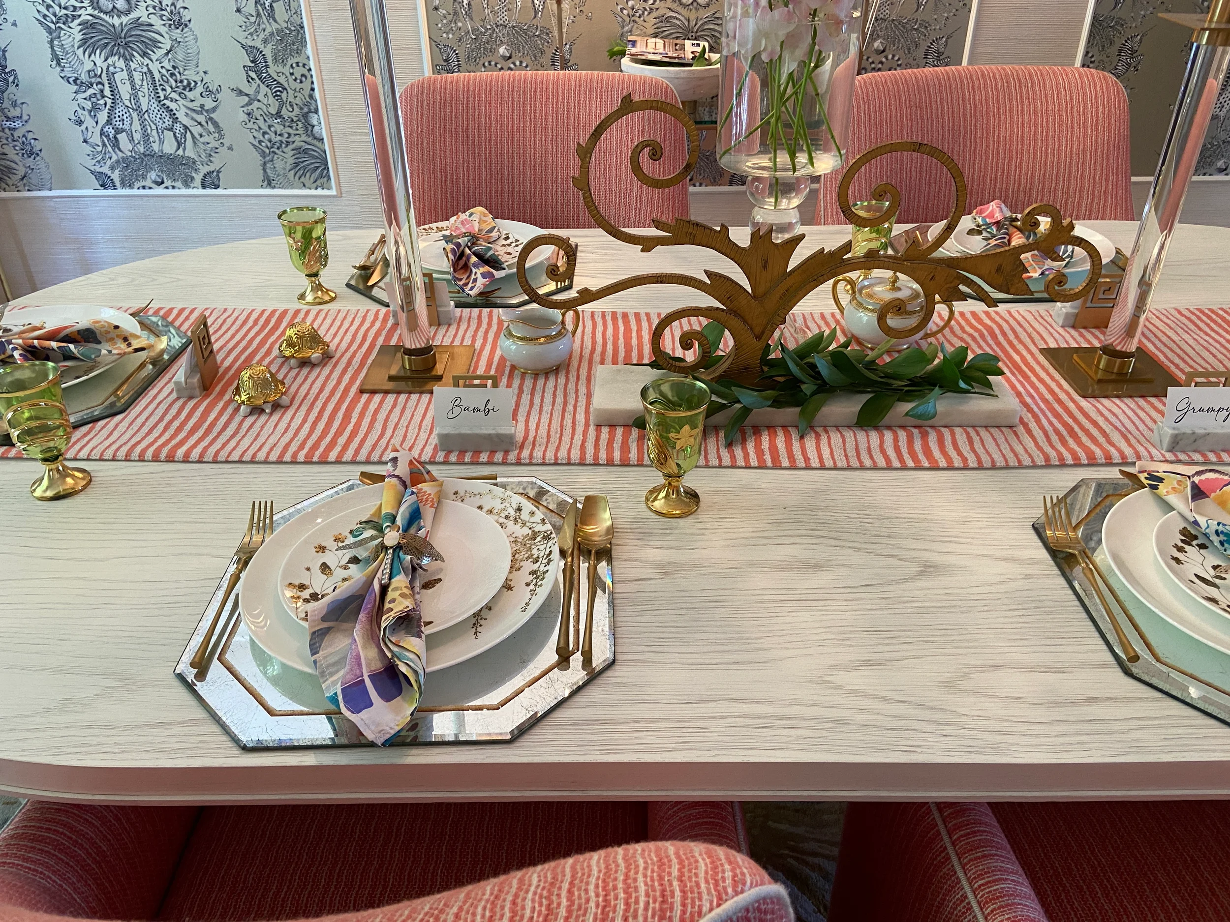 The whimsical feel of this design was breathtaking. From the dramatic gold leaf and rattan chandelier to the brass hardware, this dining room was curated for your modern day Disney Princess. My favorite details were the sprinkles of miniature creatures like the dragonflies on the napkin ring holders and the turtle shaped salt-and-pepper shakers.