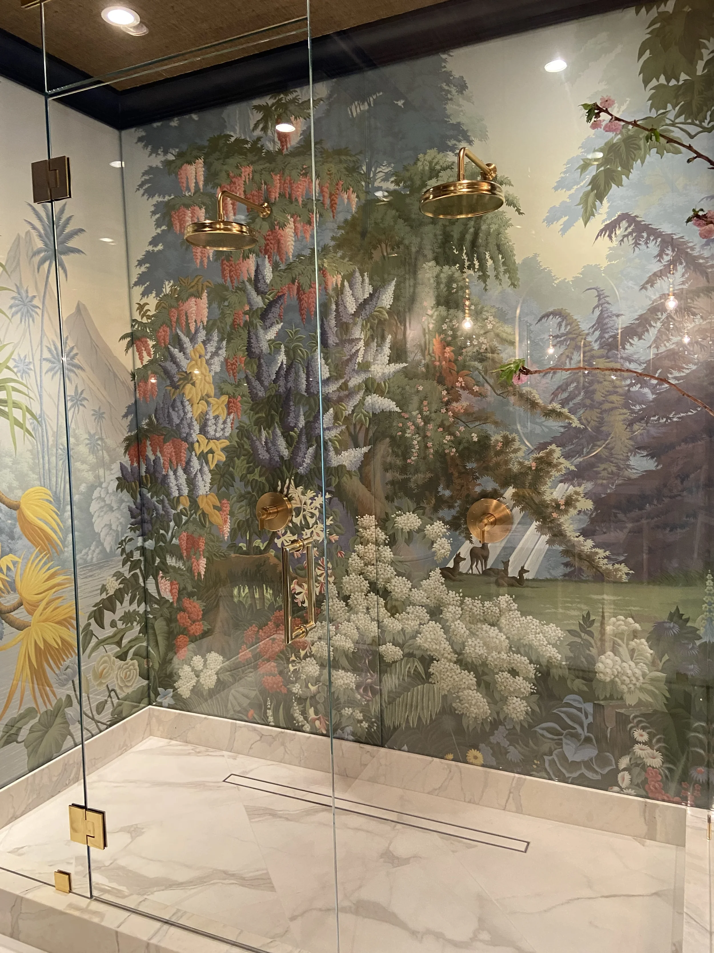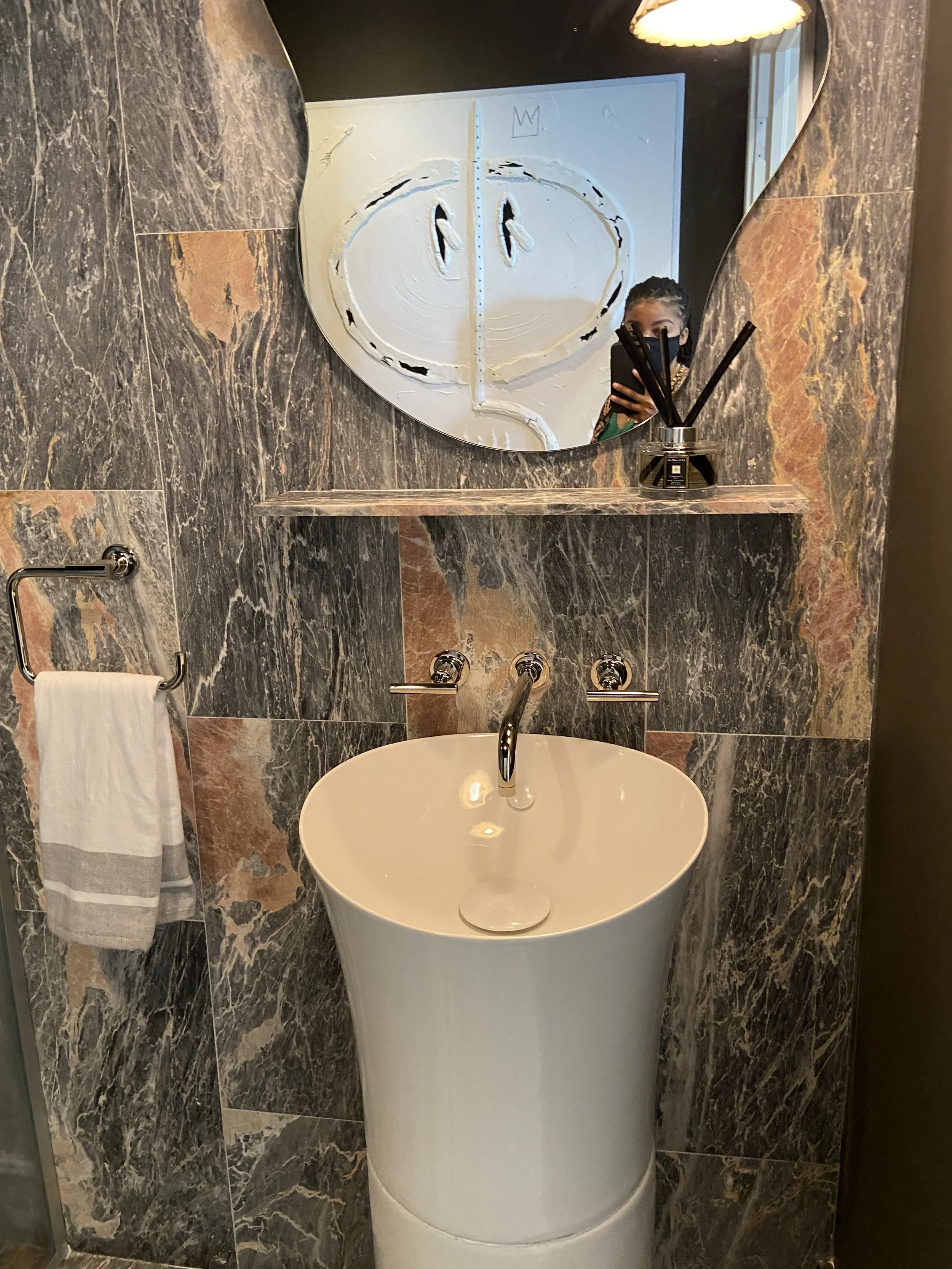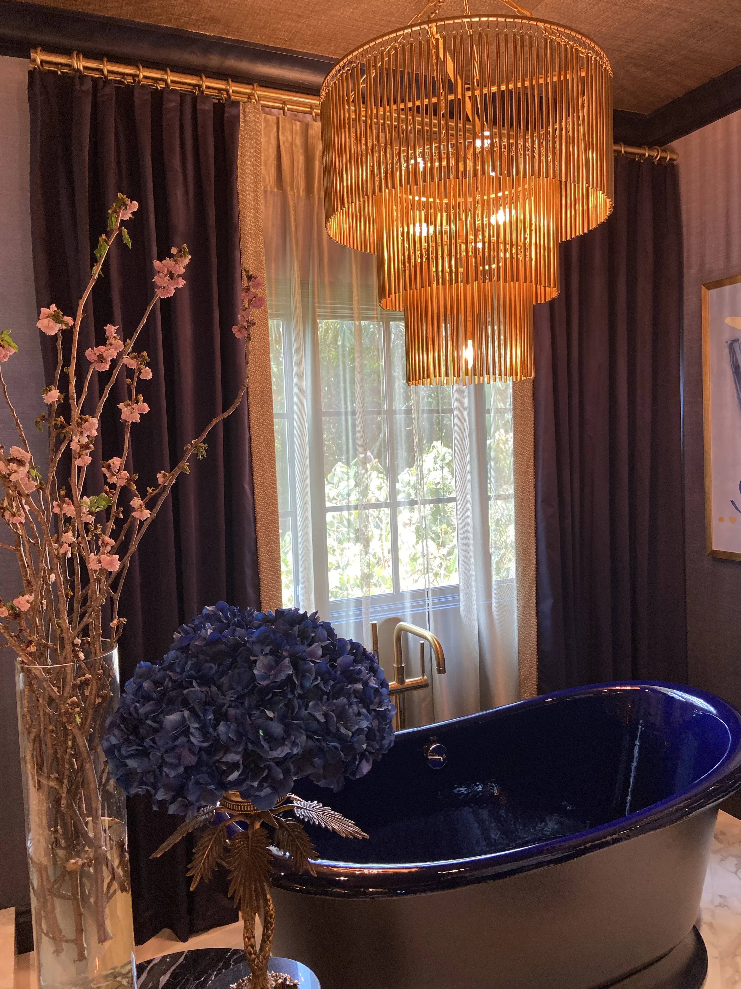 I strongly connected with this bathroom being that, like my living room, was built around one single piece. In the case of my living room, it was an art piece of Cardi B and for Naranjo it was the indigo bathtub. Her goal was for guests to feel swept into an enchanted garden. I think she achieved that and more. I was surprised to learn that most of the items, including the bathtub, are from Kohler. It may be time for me to give that brand a little bit more attention once I get underway with my home renovations.