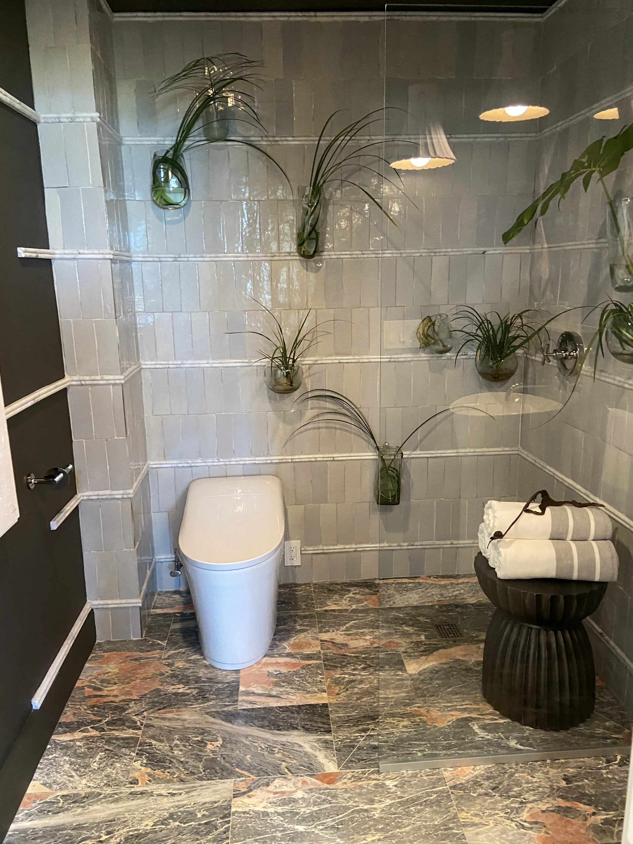 The unique color of the marble in this bathroom is something I won’t ever forget. The rainfall shower and the plant accents meshes perfectly with the modern fixtures.